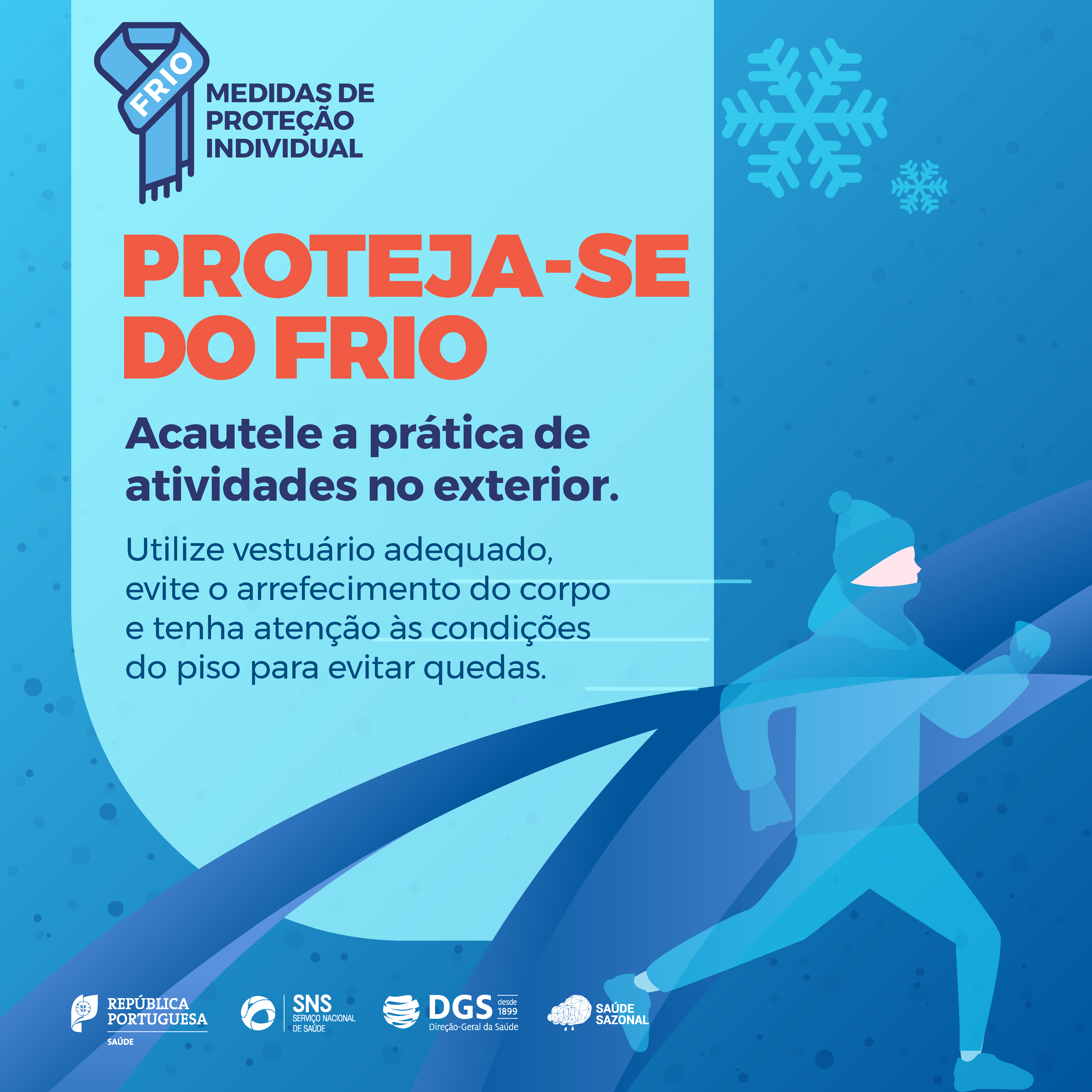 * Acautelar a prática de atividades no exterior (evitar esforços excessivos, utilizar vestuário adequado e prestar atenção às condições do piso para evitar quedas);