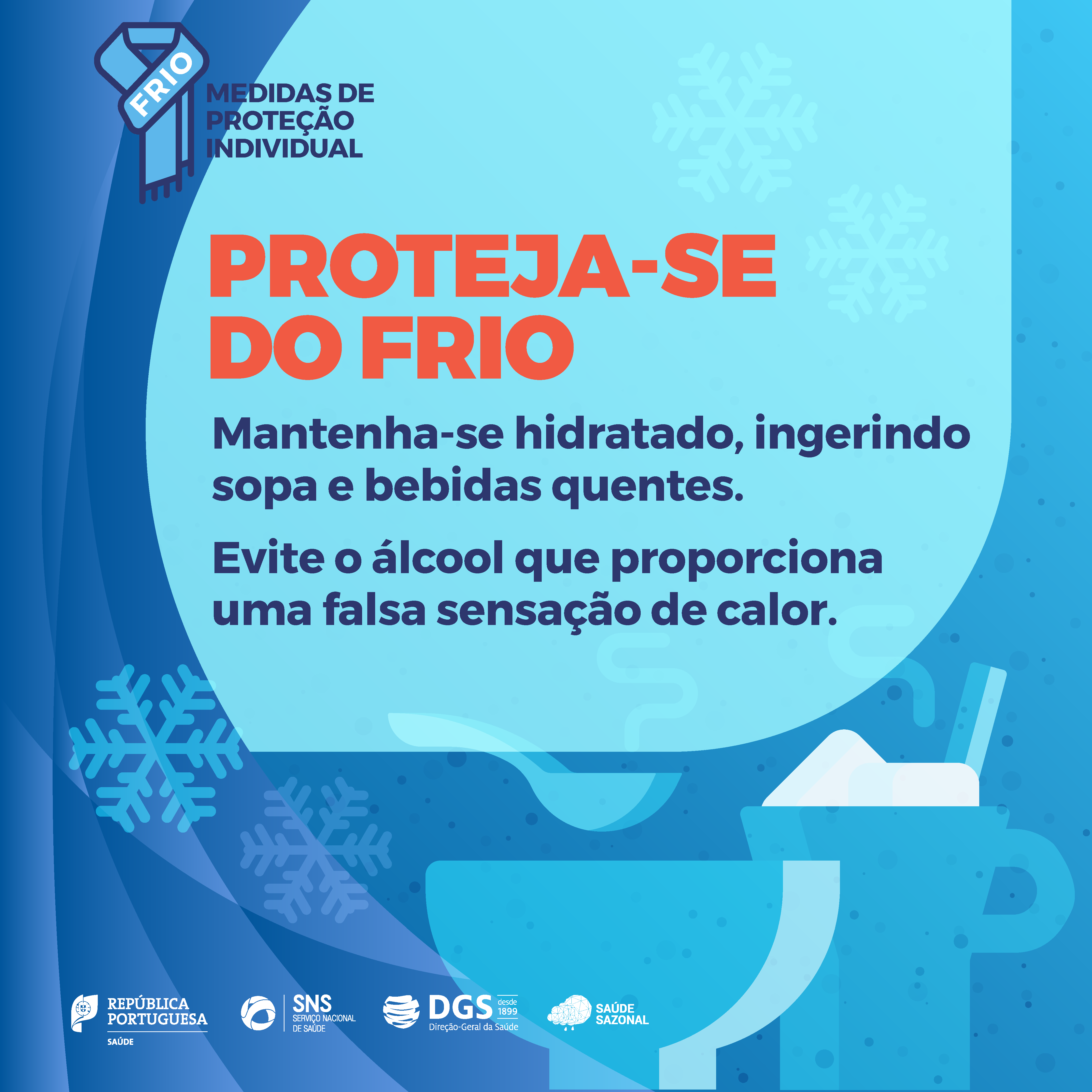 * Manter a hidratação, ingerindo sopas e bebidas quentes e evitando o consumo de álcool, que proporciona uma falsa sensação de calor;